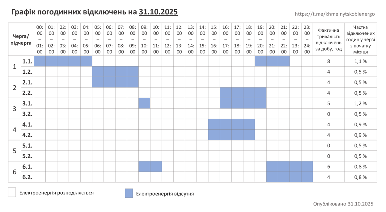 За розпорядженням НЕК «Укренерго», 31 жовтня 2025 року на Хмельниччині діятиме графік погодинних відключень (ГПВ).