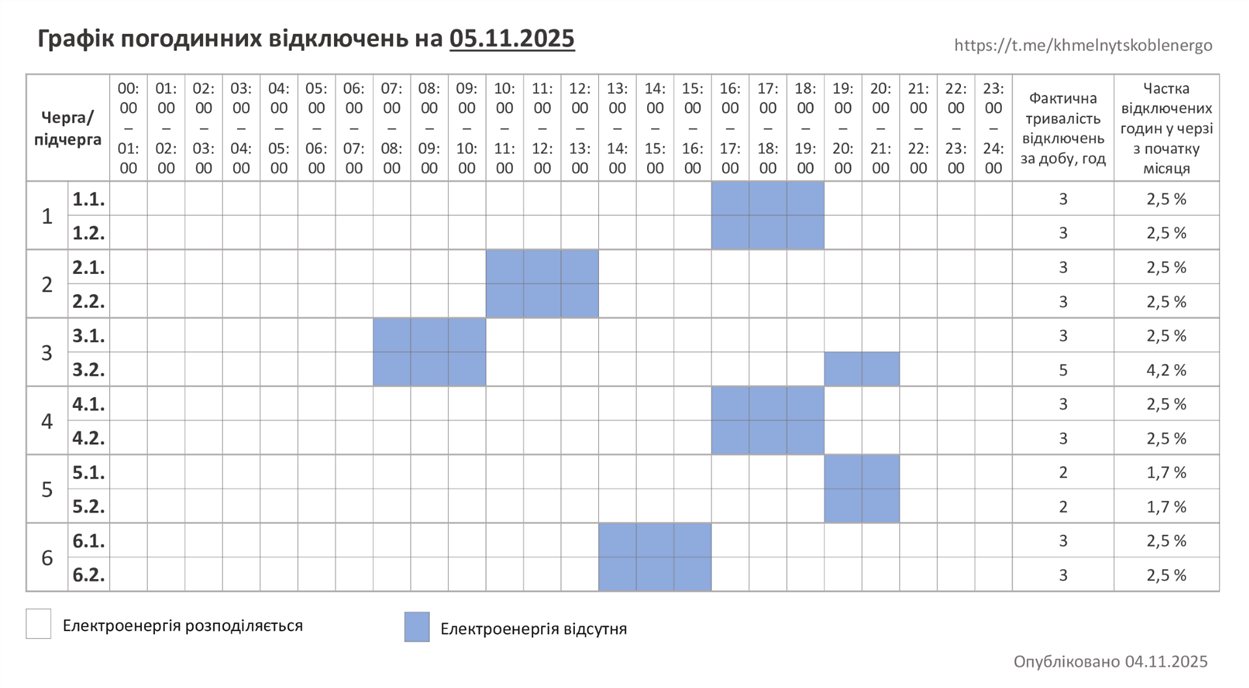 За розпорядженням НЕК «Укренерго» 5 листопада 2025 року на Хмельниччині діятиме графік погодинних відключень (ГПВ). Зверніть увагу: одна і та ж будівля може мати декілька приєднань, відповідно, вона належатиме до декількох черг.
