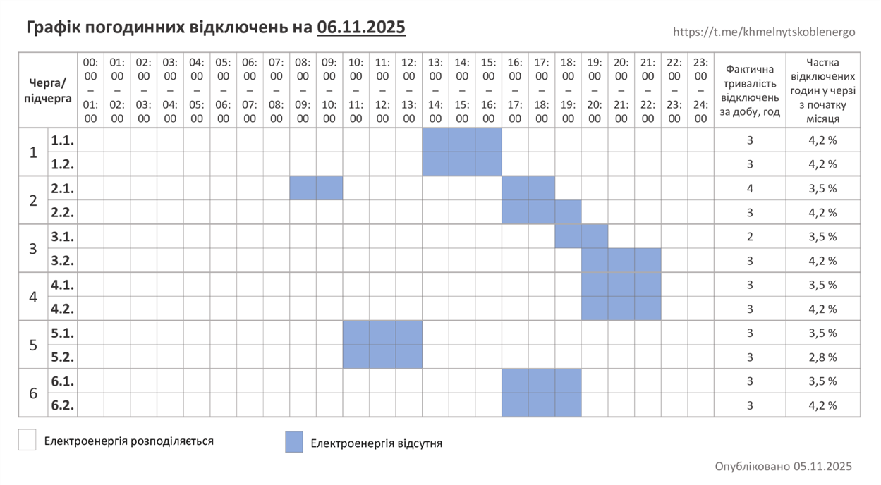 За розпорядженням НЕК «Укренерго» 6 листопада 2025 року на Хмельниччині діятиме графік погодинних відключень (ГПВ). Зверніть увагу: одна і та ж будівля може мати декілька приєднань, відповідно, вона належатиме до декількох черг.